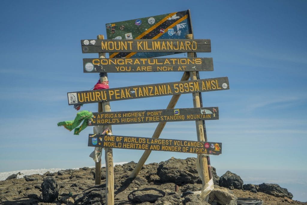 “Congratulations! You are now at Uhuru Peak, Tanzania, 5,895m. Africa’s Highest Point. World’s Highest Free-Standing Mountain.”