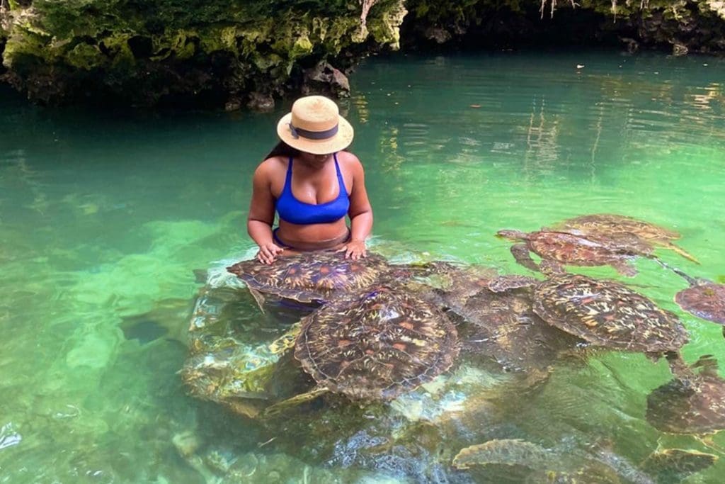 Visitors can enter a natural lagoon. Caretakers keep sea turtles safe there until the turtles are strong enough to return to the wild. At Baraka, staff members let you feed and swim with the turtles while they watch over you.